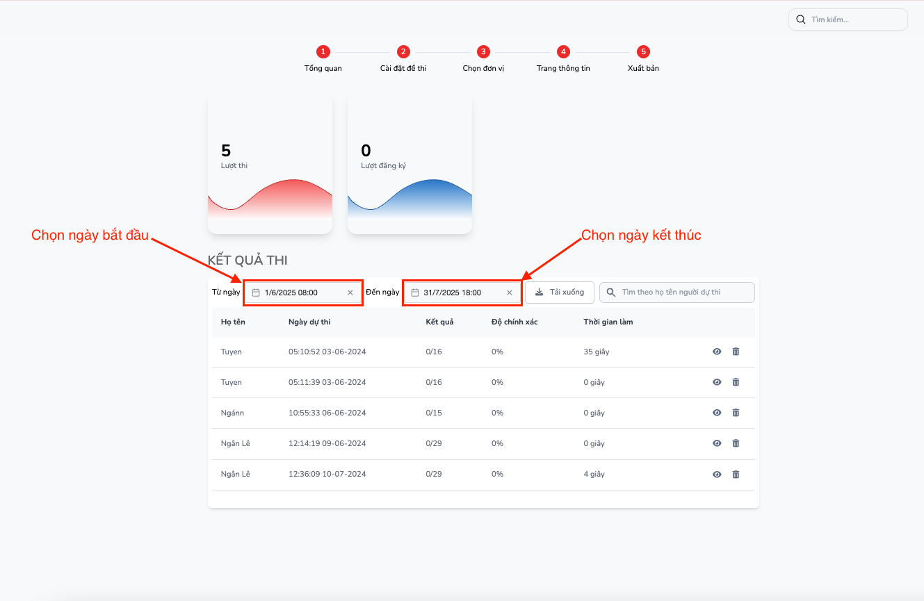 Tại đây BTC có thể chọn thống kê kết quả từ ngày bắt đầu -> ngày kết thúc ( hoặc có thể tuỳ chọn ngày muốn thống kê theo như mong muốn)