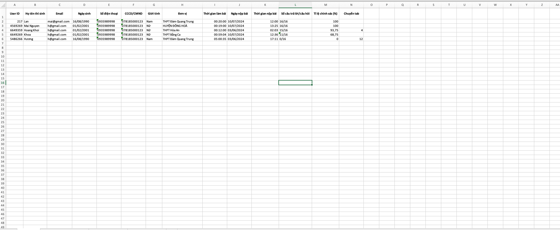 Kết quả: Đây chính là sheet có đầy đủ kết quả và thông tin của thí sinh.
